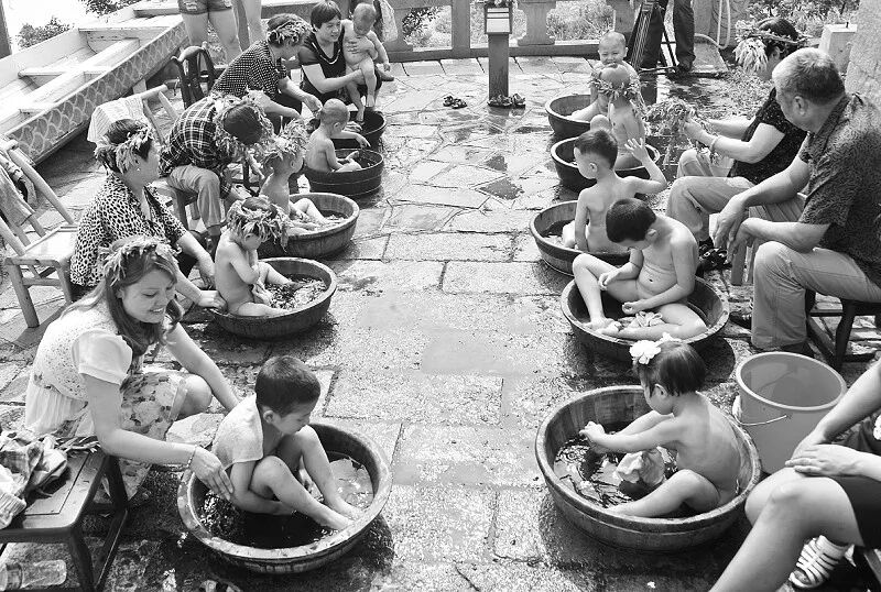 ▲用艾蒿叶煮水给小孩洗澡