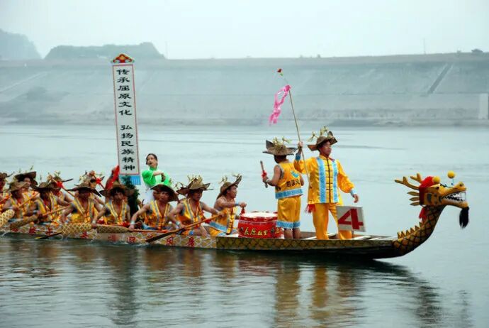 在端午节里,很多地方划龙舟,但在划龙舟前举行游江和招魂仪式,却是屈原故里所独有。相传诗人屈原听到秦军攻破楚国都城的消息后,悲愤交加,抱石投江,以身殉国。消息传到屈乡,乡亲们纷纷引舟竞渡前去打捞,沿水招魂,演变为现在的游江招魂。临江祭祀屈原,龙舟是最为重要的,几天前就将龙船打磨好,擦上油漆,到祭祀时,首先将龙头安插到龙船上,由德高望重的老人为龙点睛。杀鸡宰羊将血倒入碗中,一饮而尽,将碗重重的摔倒地上,告示赛龙船开始,然后在鞭炮声中龙船缓缓出水。白龙作为孝龙在前,其它龙船随后,在哀婉的招魂曲中,齐声高喊“我哥哟——回哟哦——”,开始游江招魂。仪式结束,才开始正式比赛。