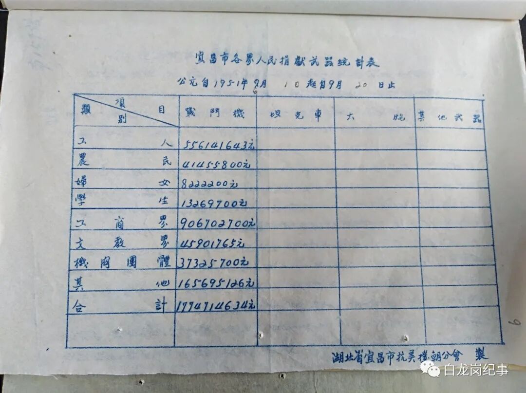 1951年6月,中国人民抗美援朝总会发出“捐献武器”通知,宜昌人民节衣缩食,踊跃捐献,至1951年12月27日,宜昌市抗美援朝分会共收到捐款4561290175元(1955年3月1日前的旧人民币,下同),按当时公布的购买武器价格,宜昌人民可捐赠战斗机3架。