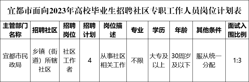 ②《宜都市面向2023年高校毕业生招聘社区专职工作人员信息表》1份。