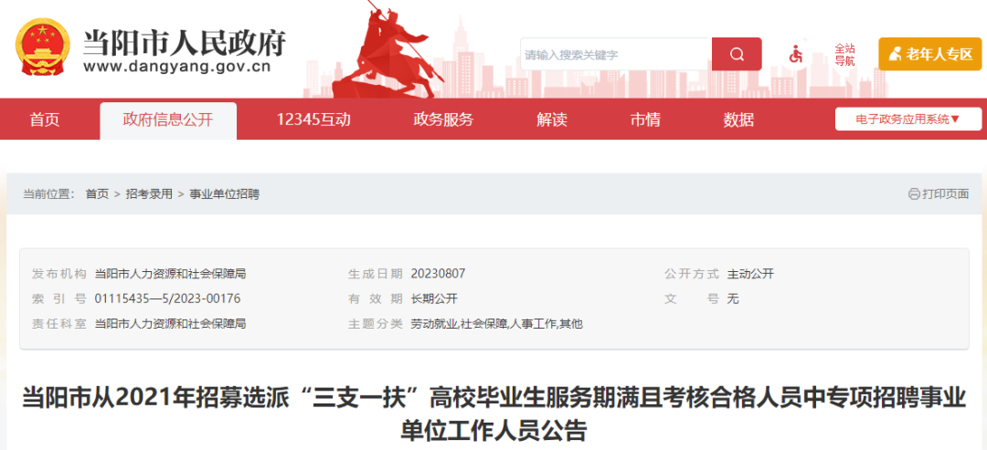 本次招聘岗位为当阳市农业农村局、当阳市卫生健康局、当阳市人力资源和社会保障局所属事业单位,共招聘4人。