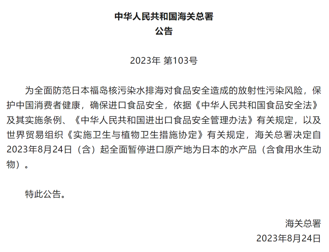 海关总署:全面暂停进口日本水产品