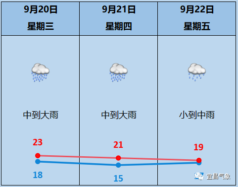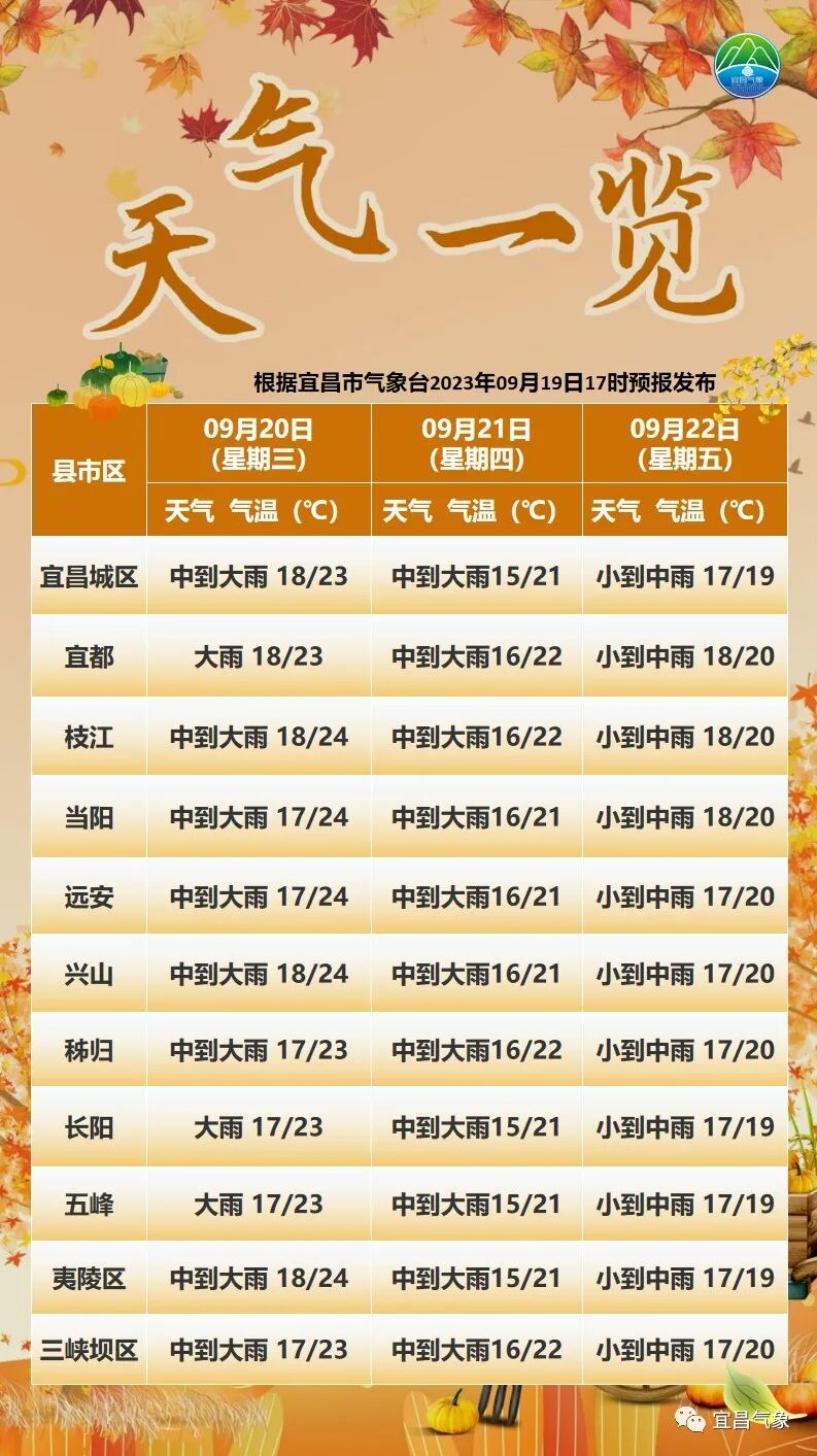 9月20日-23日:宜昌市有一次大雨到暴雨过程,气温较低,东部平原及沿江河谷风力有所加大;