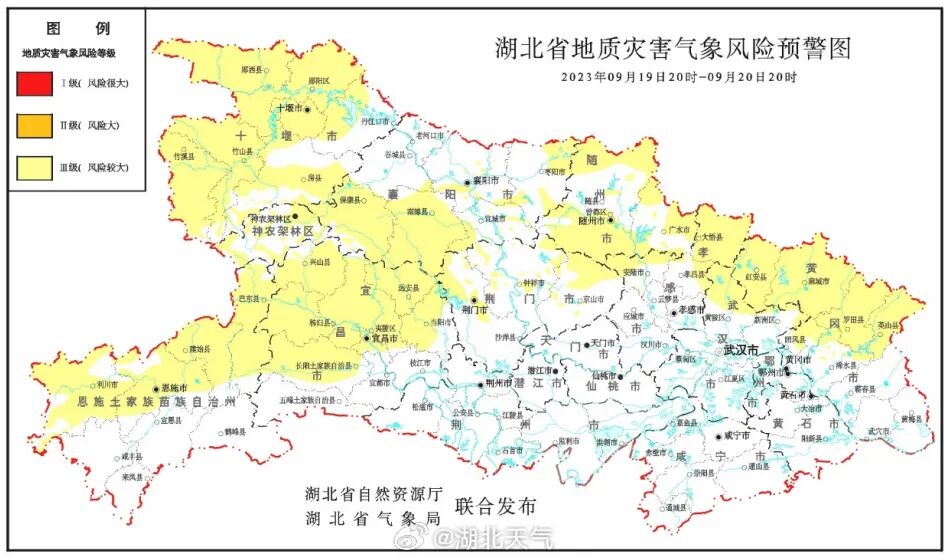 2023年9月19日20时-9月20日20时,预计三峡库区,神农架林区、十堰地区、随州地区,襄阳(襄阳市城区、保康、南漳、宜城、枣阳)、宜昌(宜昌市城区、远安、当阳、长阳)、恩施(恩施市、建始、利川)、荆门(荆门市城区、钟祥、京山)、孝感(孝昌东北部、安陆、大悟)、武汉(黄陂北部、新洲东北部)、黄冈(红安、麻城、团风、浠水北部、罗田、英山)以及其他强降水区域发生崩塌、滑坡、泥石流的风险较大,提醒公众注意防范!
