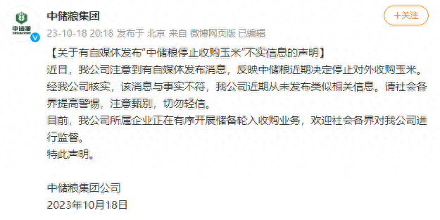 近日,我公司注意到有自媒体发布消息,反映中储粮近期决定停止对外收购玉米。经我公司核实,该消息与事实不符,我公司近期从未发布类似相关信息。请社会各界提高警惕,注意甄别,切勿轻信。