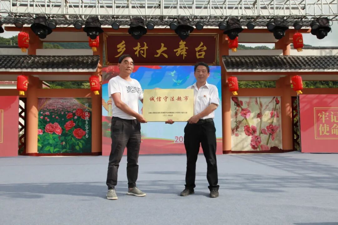 △覃劲松(左)为长乐坪镇诚信守法超市授牌