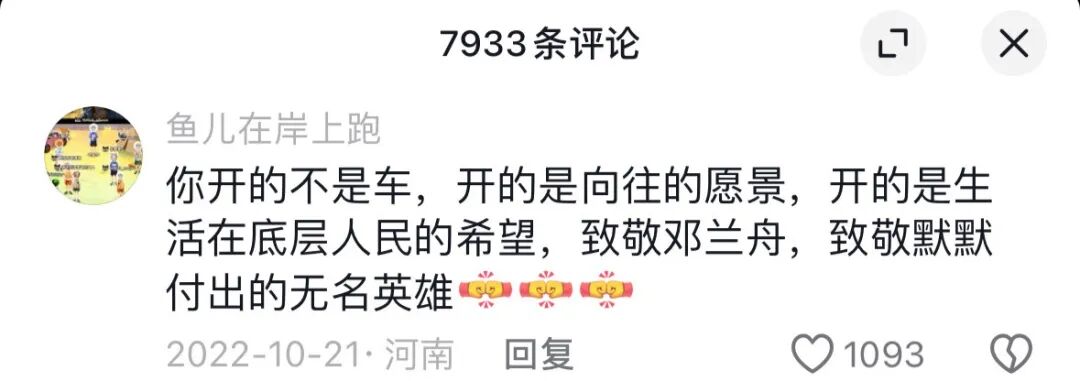 视频里托邓兰舟给在外儿女带腊肉的婆婆,背着背篓提前在路边等待“收货”的爷爷,盼望着儿孙回家过年的留守老人……都感染着网友,“你开的不是车,开的是向往的愿景,开的是留守老人的希望。”“平凡的人干着不平凡的事,向你致敬!”大家纷纷在评论区为小舟师傅点赞。如今,账号发布105个作品,获赞近300万,吸引13.4万粉丝关注。