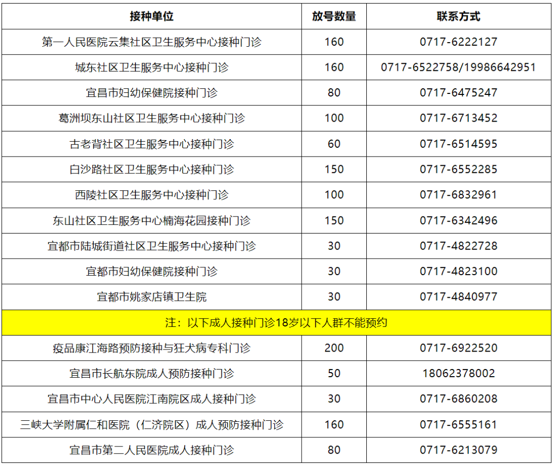 宜昌市中心人民医院江南院区、宜昌市第二人民医院、三峡大学附属仁和医院以及宜昌市长航东院属于成人接种门诊,中签的居民如未满18周岁请预约时选择其他接种门诊。