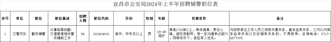 此次招聘辅警56名,招聘职位相关要求详见《宜昌市公安局2024年上半年招聘辅警职位表》。