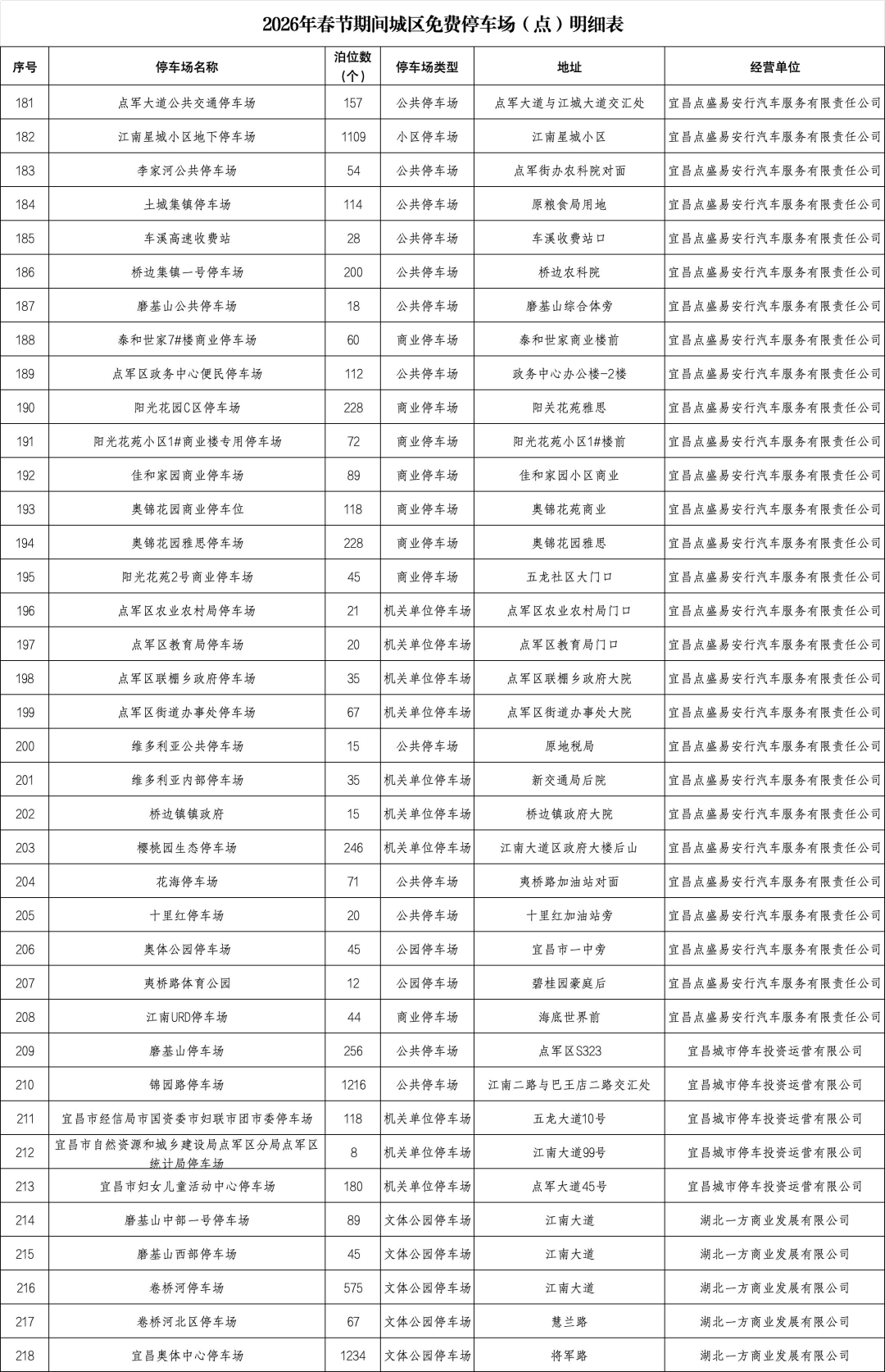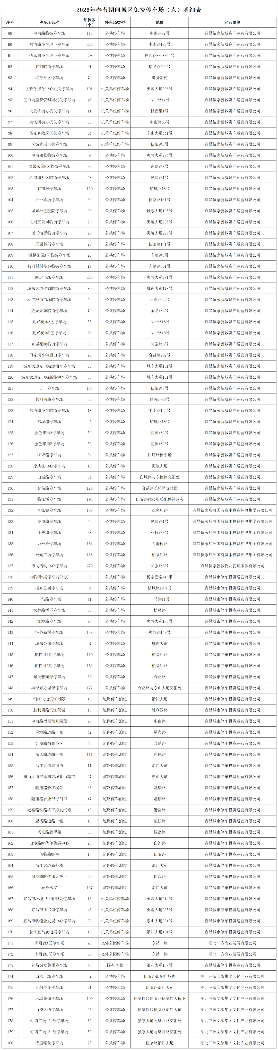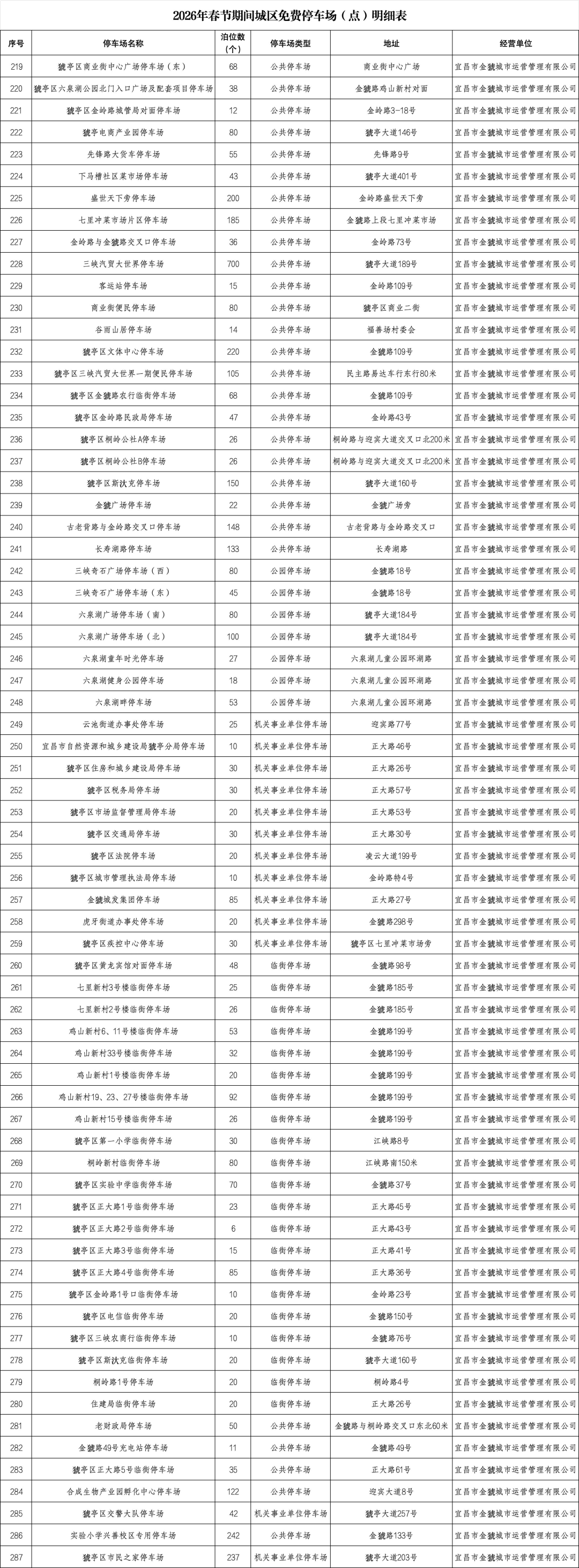 宜昌城发集团自营公共停车场及道路临时停车泊位、部分县市区属国有停车运营企业负责经营管理的公共停车场、具备条件的机关事业单位内部停车场,全市共713个停车场(点)、61570个泊位免费停放,其中城区有337个停车场(点)、 24883个泊位。